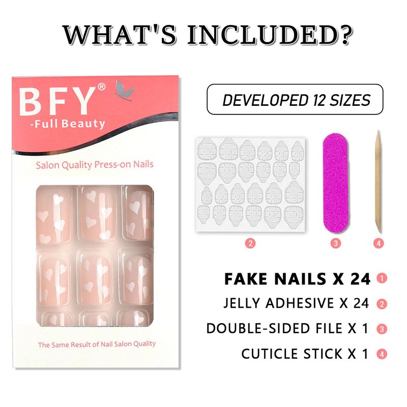 - 【BFY Press Manicure Set】-- The nail set contains 24pcs press on nails, 1* nail file, 24* jelly gum, 1* cuticle pusher. Get salon-like manicures with no need for gel polish and UV lamps.