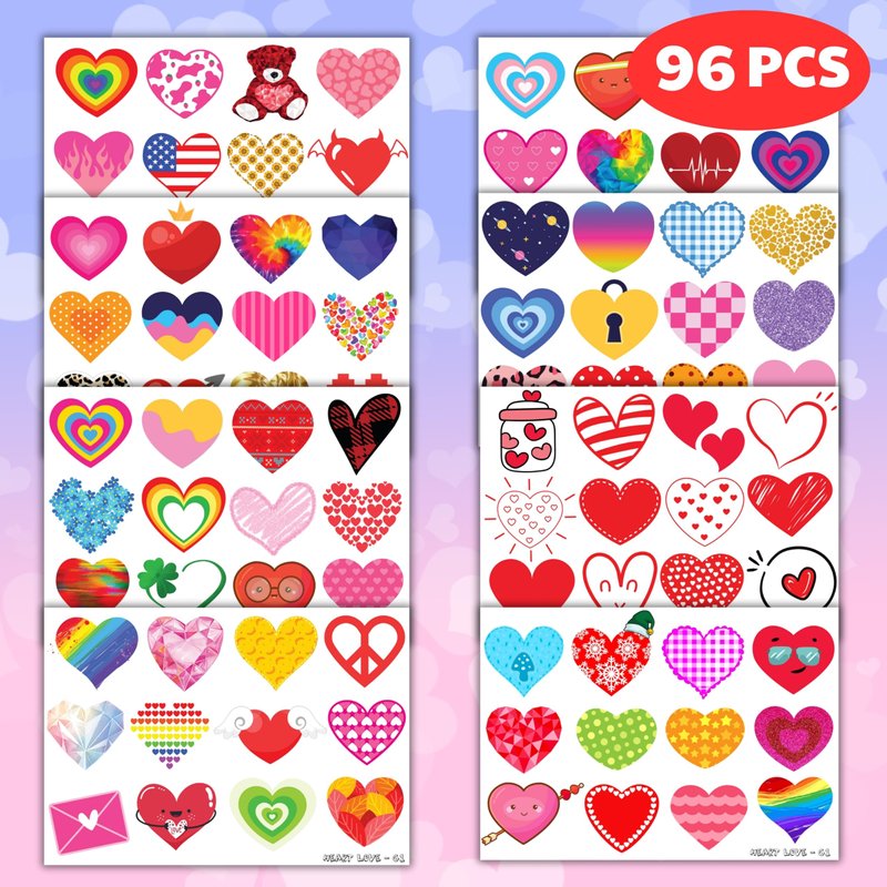 Heart Temporary Tattoos - Valentine Tattoos 96PCS Love Themed Stickers for Kids Birthday Party Supplies, Decorations, Favors, and Prizes - Cute Gifts for Boys and Girls