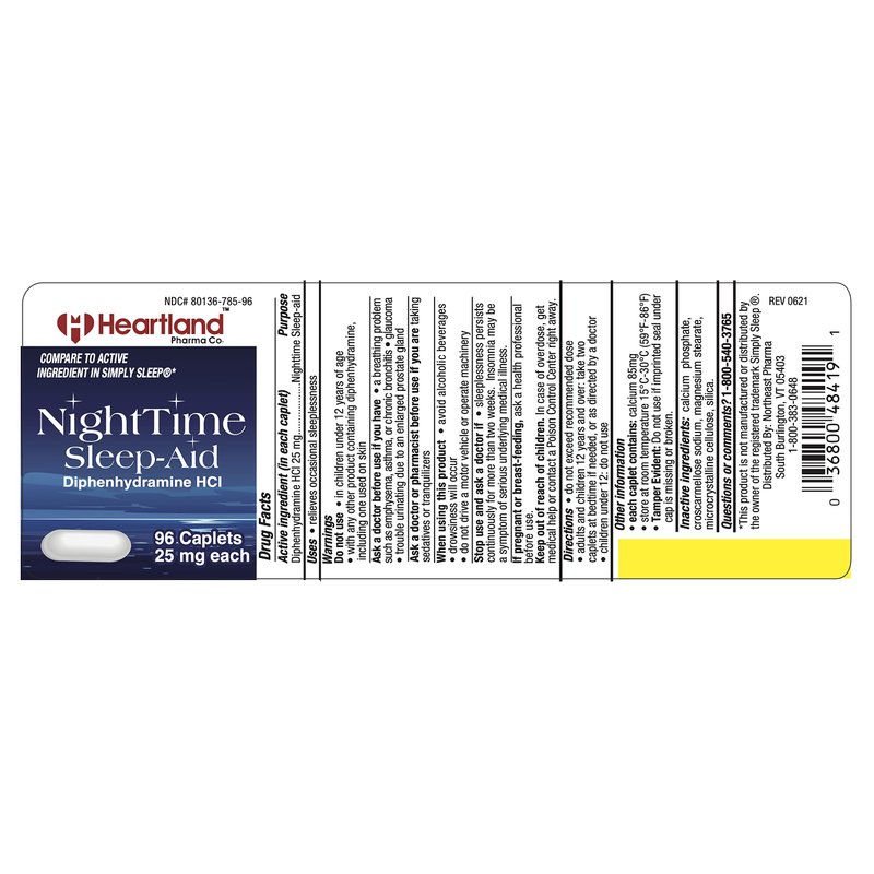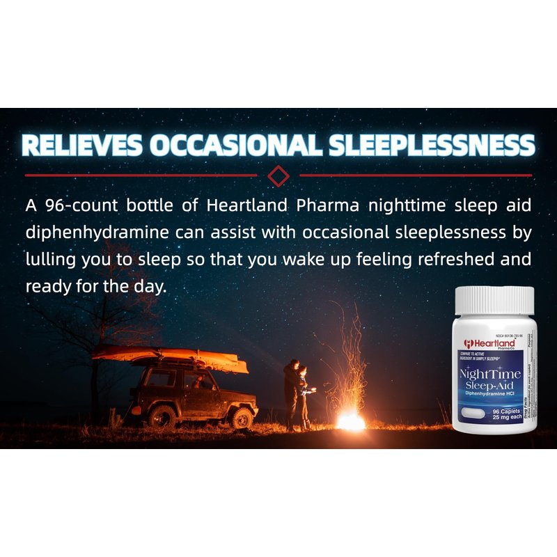- 𝐑𝐄𝐋𝐈𝐄𝐕𝐄𝐒 𝐎𝐂𝐂𝐀𝐒𝐈𝐎𝐍𝐀𝐋 𝐒𝐋𝐄𝐄𝐏𝐋𝐄𝐒𝐒𝐍𝐄𝐒𝐒: A 96-count bottle of Heartland Pharma nighttime sleep aid diphenhydramine can assist with occasional sleeplessness by lulling you to sleep so that you wake up feeling refreshed and ready for the day. Compare the active ingredient in Tylenol Simply Sleep with the sleep aids made by Heartland Pharma.