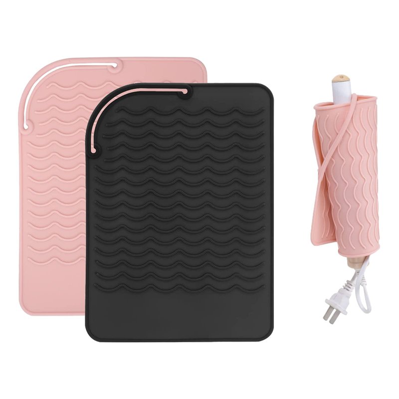 Heat Resistant Silicone Mat for Hair Tools - Pink Flat Iron Pad, Black Curling Iron Pad, Travel Portable Hot Tools Mat (1+1 Pack)
