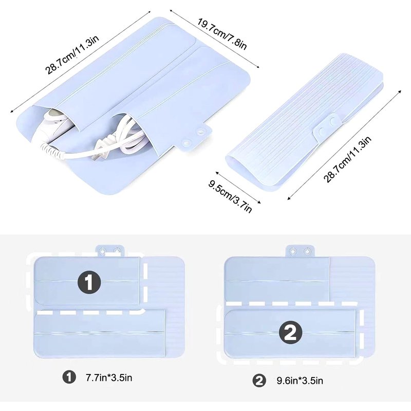 - The travel hair tools are suitable for most sizes of straightening irons and curling irons, and can also be used to store your chargers, power cords, headphones, etc. The heat-resistant mat for hair tools is lightweight and can be placed in a drawer, suitcase, bag, or school bag. The travel bag can be washed and reused, saving resources.