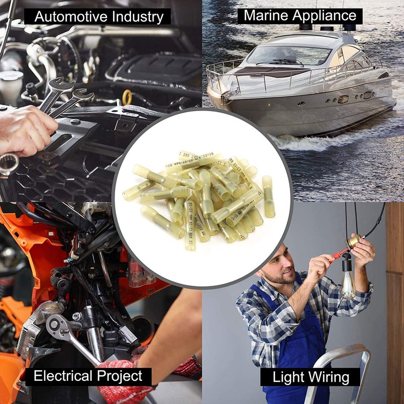 - 【MADE TO LAST】- Thanks to the thick tinned copper and seamless barrel desgin, it ensures strong and secure crimping all the time with no wire coming off issues. What's more, the polyolefin heat shrink tubing provides the high tensile strength and resistance to mechanical damage so there's no worry of rat chewing or similiar phisical damage issues. When heated with a heat gun, the adhesive melting inside create a waterproof and insulated seal, preventing electric leakage and corrosion
