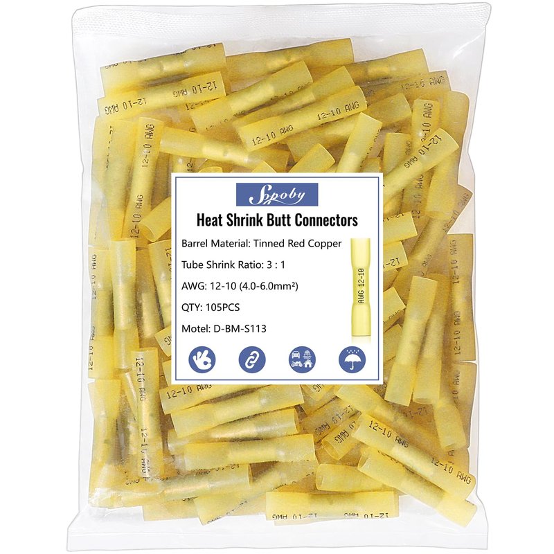 Heat Shrink Butt Wire Connectors, Sopoby 105Pcs 12-10 AWG Yellow Insulated Waterproof Electrical Wire Connectors Automotive Marine Grade Wire Crimp Terminals Butt Splices, Ideal for Boat, Truck,Yellow
