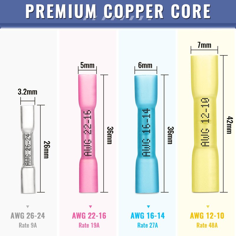 - ♥ PREMIUM COPPER CORE AND HEAT SHRINK TUBE: Made of high quality tinned copper and adhesive lined heat shrink tubing. These professoinal butt connectors ensure protection against the elements. Heat shrink tubing provides high tensile strength and resistance to stretch and mechanical damage, high thickness copper core ensure protection against the elements.