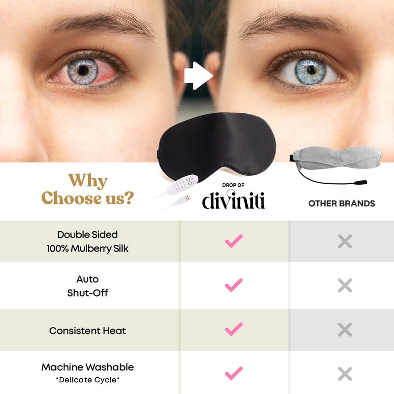 THE HEATED SILK EYE MASK THAT SOOTHES, RELAXES AND ADJUSTS TO YOUR NEEDS Block out light to fall asleep and stay asleep! Our warm eye compress mask provides you the added comfort & healing benefits of heat and the luxury of soft, smooth silk against your skin. Set your preference and relax immediately! FEATURES:100% Silk fabric exterior Interior graphene heat film Adjustable elastic strap 4 temperature settings 4 timer settings 6-ft cable with USB port & DC plug Support for Headaches, Eye & Sinus Issues and More This one dry eye mask is the tool for self-care! Who has time to receive sufficient rest and healing in our busy day-to-day lives? This mask is simple and easy to use. It can even be used in conjunction with eye drops, eyelid cleansers and scrubs. Loved by Customers of All Ages Many customers use this product as a sinus mask to reduce suffering from migraines and sinus pain. Our soft silk eye mask will give you the comfort of moist heat and help you fall into a healing sleep. HOW TO USE1. Insert just the USB plug/controller into the power source2. Turn on controller by tapping temperature to your desired settings3. Connect DC Plug from mask to controller.4. Spritz warm water on the eye-facing side of the mask for moist heat.5. Tap and toggle timer. (0 setting keeps the mask on until turned off or unplugged.) A Gift for Yourself or a Loved One This heated eye mask is a thoughtful gift for any loved one (or yourself!). Anyone who experiences recurring sleep issues, headaches, eye strain or pain will appreciate receiving this luxurious silk heated eye mask. They’ll be able to use it as often as they like, and it will offer comfort for years to come. bruder mask for dry eyes optase moist heat mask eye stye remover dry eye heat compress warm compress bruder eye compress moist heat bruder moist heat eye compress bruder eye mask eye heating pad thermalon dry eye moist heat compress stye eye compress eye warmer for dry eyes heated eye mask for dry eyes electric