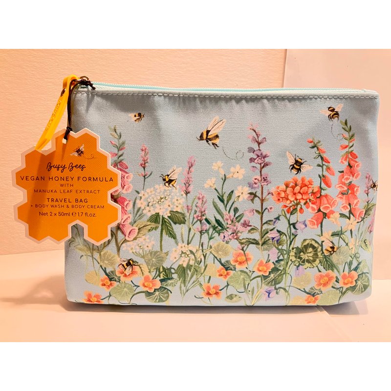 - A set of 2 travel sized bee loving products: body wash & body cream 50 ml each in a travel bag with bee and flower motif.