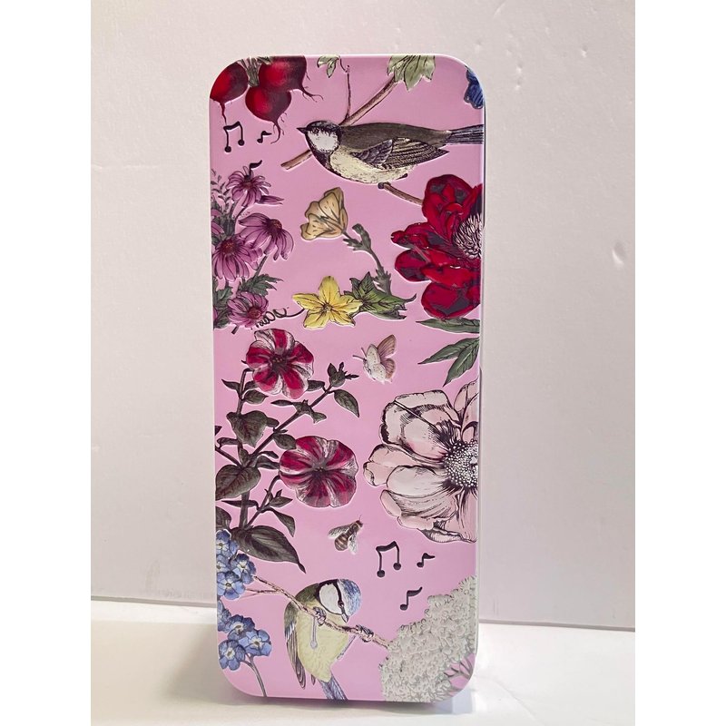 - 50% recycled plastic tube tucked inside a keepsake tin embossed with flowers and birds from the garden