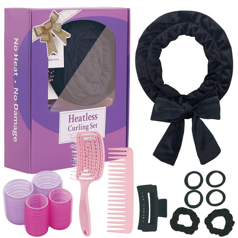 - Heatless Curling Set:70-inch velvet hair curler, 2 velour hair ties, 4 elastic hair ties, hair clips, wide-tooth comb, detangling brush, 4 hair rollers, and it's well-packed with an exquisite gift box. Perfect rollers hair curlers gift set for all women and girls.