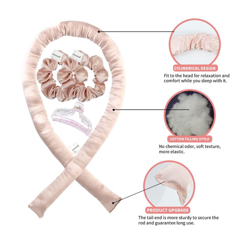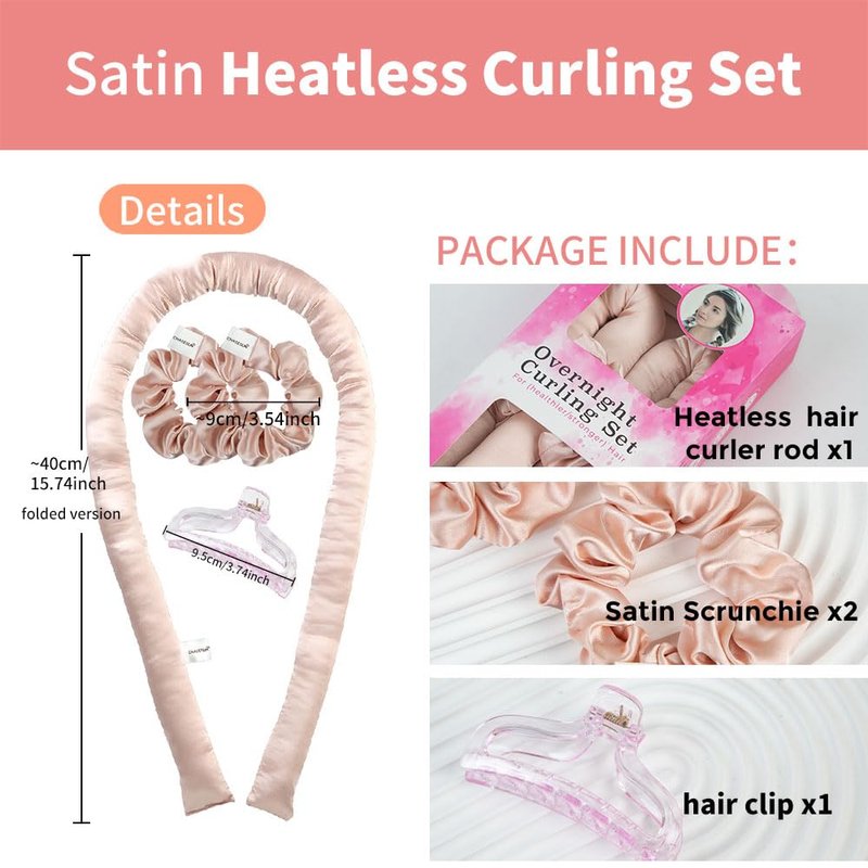 - 【Hair Rollers for Heatless Curls】To avoid damaging your hair, this heatless curling set includes a curling rod, two satin scrunchies,and a claw clip.The curling wand is made of satin material with cotton filling, providing a comfortable and environmentally-friendly experience. The headbands are also made of satin material, adding a luxurious touch.
