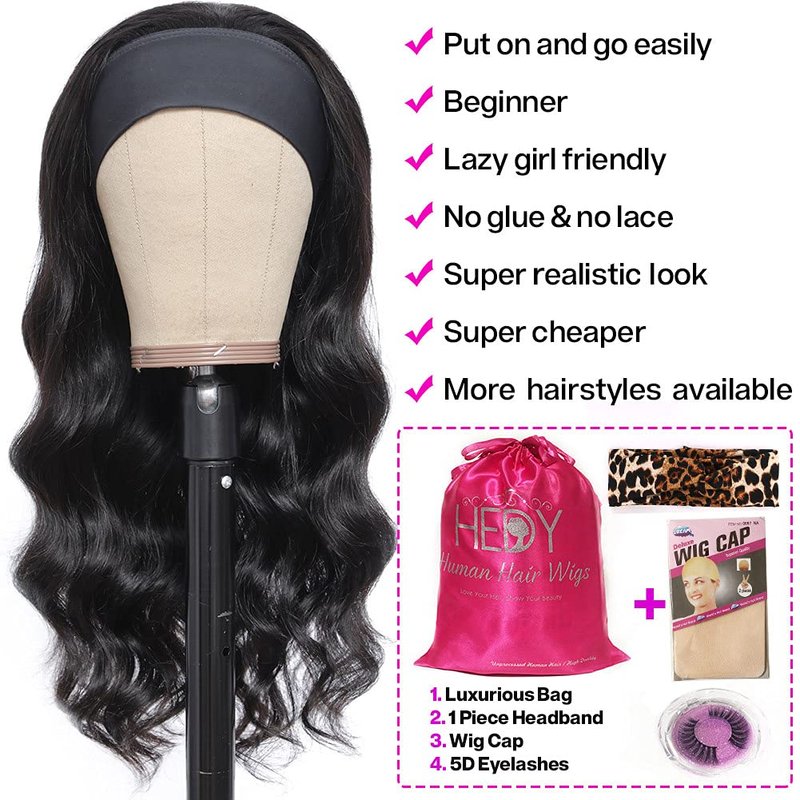 - 5.What's in the package?Body Wave Headband Wig with Cute Headband + 5D Eyelashes + Wig Cap