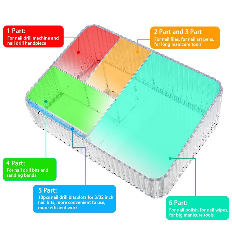 - 【Exquisite Five-Slot Design】This nail organizer and storage tray features 5 compartments and a removable 10 holes nail drill bits holder, the left layer with 4 small compartments for holding small nail tools, such as nail drill machine, sanding bands and nail file, and so on. The right layer with a big compartments for storage big nail tools, such as nail wipes, nail polish as well as other nail must haves.