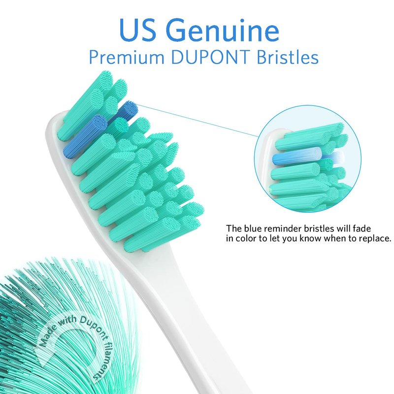 Heepim Replacement Toothbrush Headsa. Works as Good as the Original, for A Lot Less Money. b. Hepls Keep Teeth Clean and White. c. Healthy and Safety Standard. Gentle but Effective Cleaning The angled neck assures effective cleaning on the surface and at hard-to-reach areas. End-rounded bristles protect your teeth and gums from being hurt. Genuine US Dupont Bristles 100% same as name brand, planted skillfully to avoid falling off. Enjoy Your Brushing The replacement heads are much more durable thanks to the upgraded PP material. Always be on-time for Replacement Reminder bristles fade in color to let you know when it’s time to replace your toothbrush head. Dentist suggests the replacement every 3 months. These brush replacement heads are compatible with all SCREW-ON Philips Sonicare E-series toothbrush handles! The Following Handles are supported: -For Sonicare Essence | E-Series -For Sonicare Advance -For Sonicare Elite -For Sonicare CleanCare -For Sonicare Extreme These replacement brush heads are compatible with all of the following SCREW-ON handle models: HX3xxx: HX3300 HX3351 HX3500 HX3551 HX3881 HX4xxx: HX4002 HX4101 HX4011 HX4321 HX4472 HX4511 HX4572 HX4573 HX4772 HX4871 HX4872 HX5xxx: HX5130 HX5251 HX5300 HX5310 HX5350 HX5351 HX5352 HX5400 HX5451 HX5500 HX5551 HX5581 HX5610 HX5611 HX5751 HX5752 HX5754 HX5810 HX5853 HX5910 HX7xxx: HX7351 HX7361 HX7381 HX7551 HX7553 HX7800 HX7841 HX7881 HX9xxx: HX9500 HX9551 HX9552 HX9553 HX9562 HX9842 HX9882 Other: Advance e-4000/Essence e-5000/Elite e7000/e9000/Xtreme/e3000 Package: Six SCREW-ON toothbrush heads and six hygienic travel caps. Disclaimer: These toothbrush heads are manufactured independently by Heepim.
