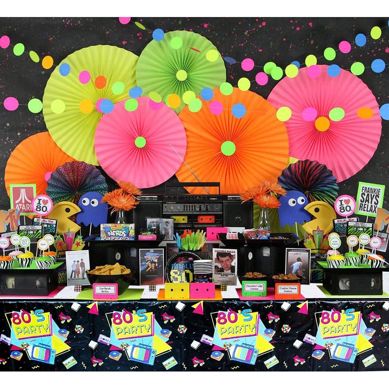 - VALUE PACKAGE - 80’s Theme Party Tablecloths including 4pcs 80’s tablecovers, the perfect retro-style design; The festive neon color design makes your party more colorful and make your table settings look fantastic.