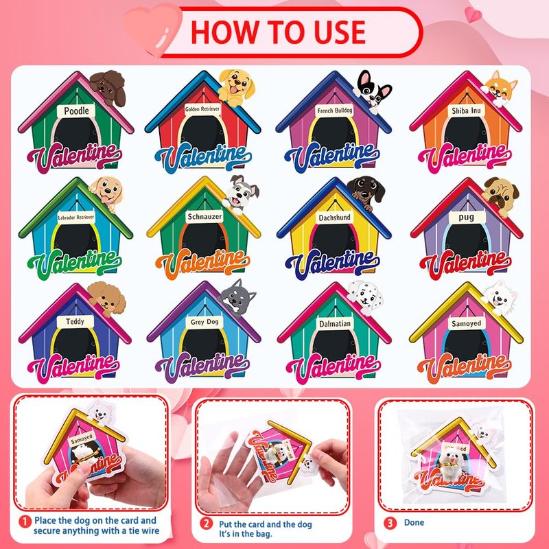 - Package Include- This Valentine's Day party gift set includes 24pcs puppy statue, 24pcs dog house card, 24pcs gold foil wire, 24pcs transparent opp bag, complete products and accessories. This is the ideal Valentines day cards with dogs figurines combo to meet your child's gift exchange needs and party preferences on Valentine's Day!
