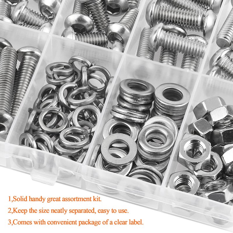 - 【Package】147 pieces in total, packed in a durable transparent box with label. It is easy to distinguish the size of the product, when you want to use a certain screw, you don't have to waste time buying it separately, you can choose the suitable one to meet all your needs.