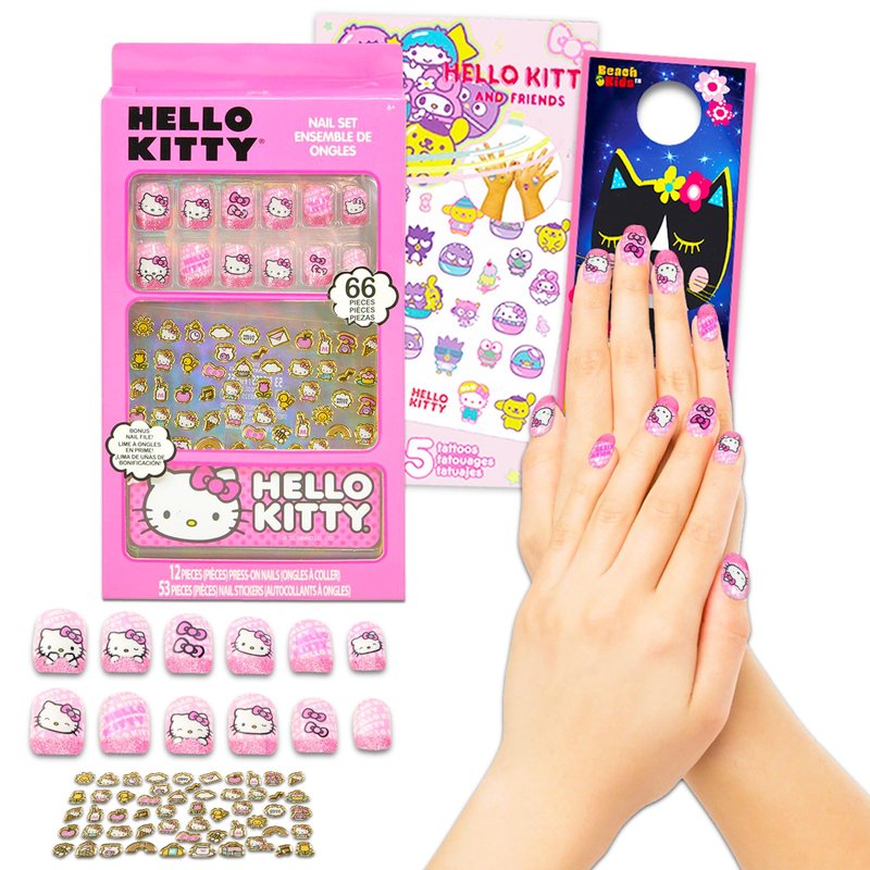 - Officially licensed Hello Kitty nail activity set for kids of all ages also comes with Hello Kitty tattoos and a Beach Kids cat door hanger.