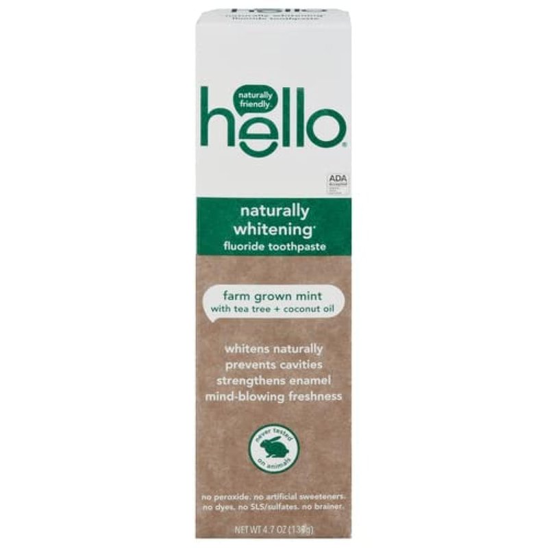 - Hello naturally whitening fluoride toothpaste is SLS free and thoughtfully formulated with a calcium mineral blend that naturally whitens teeth. Its farm grown super-peppy peppermint and tea tree oil tame bad breath, and coconut oil moisturizes for extra friendliness.