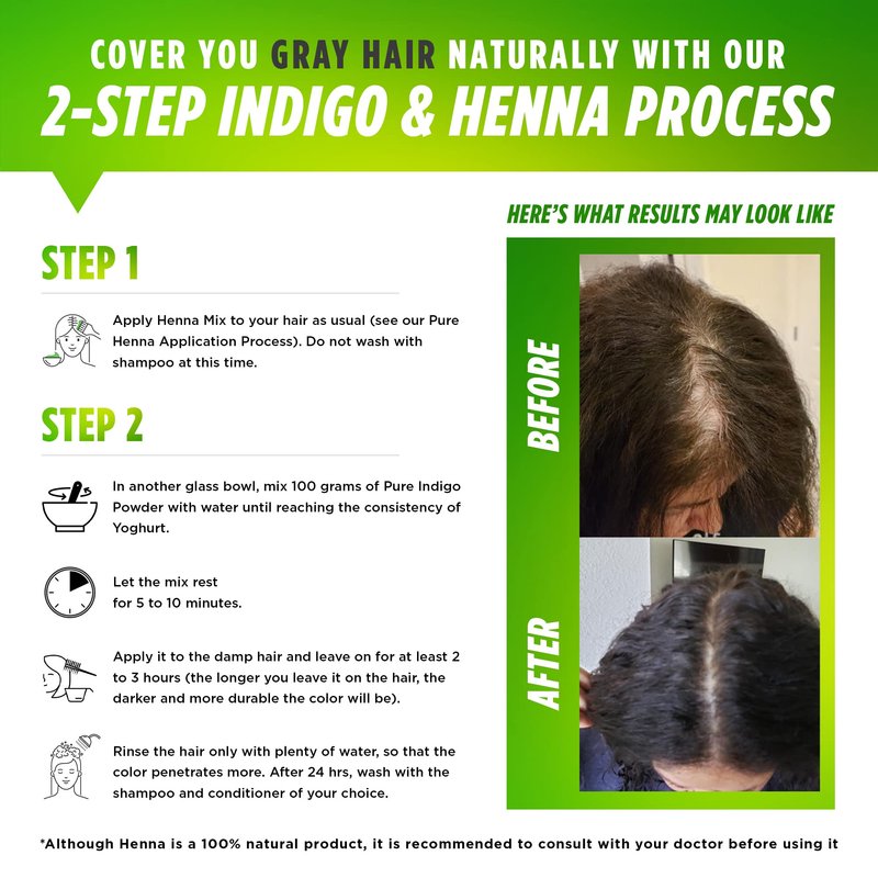 Experience the benefits of this red/brown color henna hair dye. Cover your grays naturally using our 2-step henna and indigo processes. (1) Apply the pure henna powder as instructed, (2) mix 100 grams of indigo powder with water, let it rest for 5-10 minutes then apply it to the damp hair and leave it on for at least 2-3 hours. Rinse the hair only with plenty of water so that the color penetrates more and next day wash it with the shampoo and conditioner of your choice.