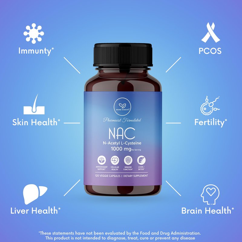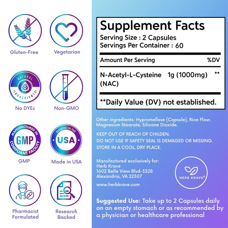 Herb Krave NAC Supplement N-Acetyl Cysteine 1000 mg, Amino Acid, Natural Antioxidant, Support for Liver, Lung, Immune System, Fertility | 120 N-Acetyl-L-Cysteine Capsule