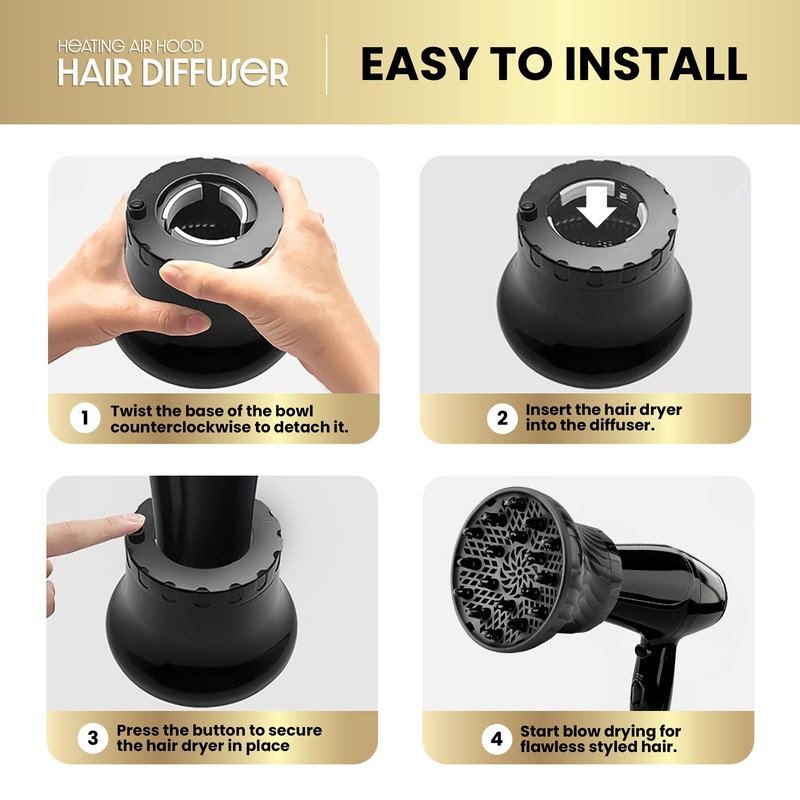 • How to use: Twist the base of the bowl counterclockwise to detach it. Insert the hair dryer into the diffuser. Press the button to secure the hair dryer in place. Start blow drying for beautifully styled hair.