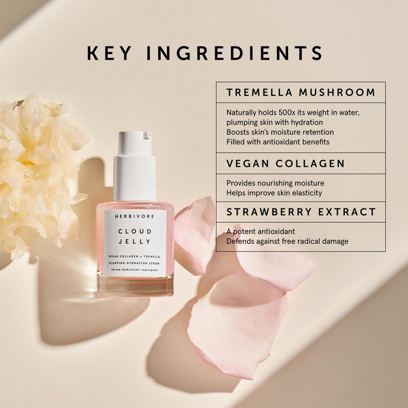 HERBIVORE Cloud Jelly Plumping Hydration Face Serum – Vegan Collagen + Tremella Mushroom + Strawberry Extract, Plant-based, Vegan, Cruelty-free, 30mL / 1 oz