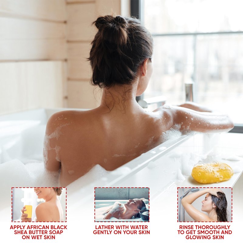 - Indulge in an amazing bathing experience: Begin by wetting your skin with warm water and gently massage our Black soap Shea Butter bar onto your skin in circular motions until a rich lather forms. Enjoy the relaxing and soothing scent of Shea Butter.