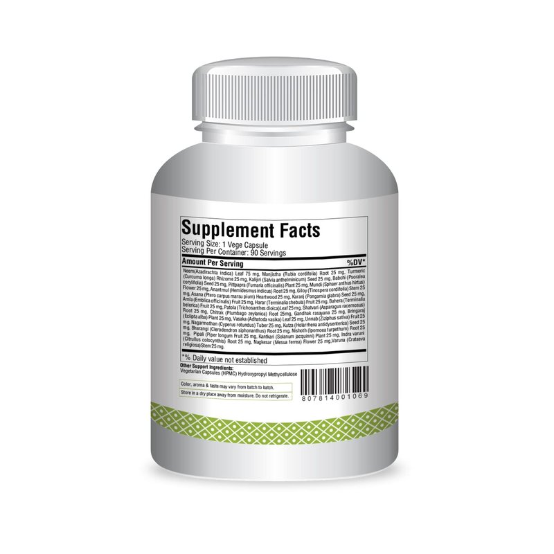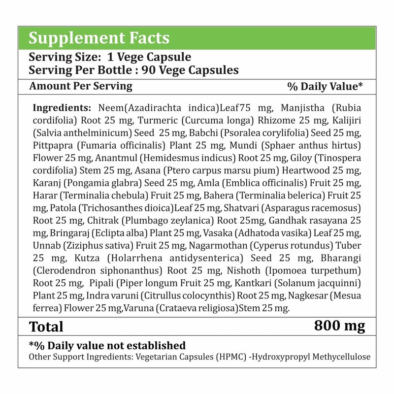 Blood problems occur because of excessive intake of liquid, fatty & heavy diet, (long term) suppression of emesis & other natural evacuatory reflexes, excessive intake of salty, sour, oily food etc. due to this all doshas i.e Vata (Air), Pitta (Fire), Kapha (Water) are imbalanced & effect the Rakta (Blood) that. Skin is the mirror that reflects the qualities of Rakta Dhatu (Blood). Hence common saying that glowing skin is the result of good quality of Rakta (Blood). —Food to Avoid: Vegetables like baingan (Eggplant), Bhindi (Lady's Finger/Okra), Arbi (Coco Asia), Kachalu (Cesculent Roots). All vegetables contain edible seeds. Tomato (Unripened), Raspberry, and Massor Ki Dal (Egyptian Lentil) are all these types of products make the blood dirty. These should be avoided. —Food to Favor: Light diet containing Rice, Green Gram Soup, Bitter Gourd, Green Leafy Vegetables, Papaya, Drum Stick, Pomegranate, Amla, Cucumber. —Non-GMO, Gluten-Free, Vegetarian (Cruelty-Free product), Ayurvedic Authentic Traditional Ayurvedic Formulation in respect to ingredients, quantity, and preparing method as per Ayurvedic textbook (API) (Ayurvedic Pharmacopoeia of India).Quality and quantity as per the formula approved by Dept. of Ayush, Govt. of India. High-Quality Extracts and micronized powder of wildcrafted herbs from their natural habitat, organic/wildcrafted. The product is concentrated extract form. Extract enhances potency, efficiency. and health benefits. The extract is dried with the power of the same herb(not with corns, rice powder, or starch powder).No addition of gluten soya milk, wheat peanuts, shellfish preservatives colors. Extract of exact depends upon the quality of the herbs. Standardization and herbal Capsule according to intake dose. Vegan capsule Suitable for all . Herbs are washed in cold water to keep the full potency/retain properties of herbs which might get lost some in water flow. The product is prepared as per traditional Ayurvedic standards.All the material