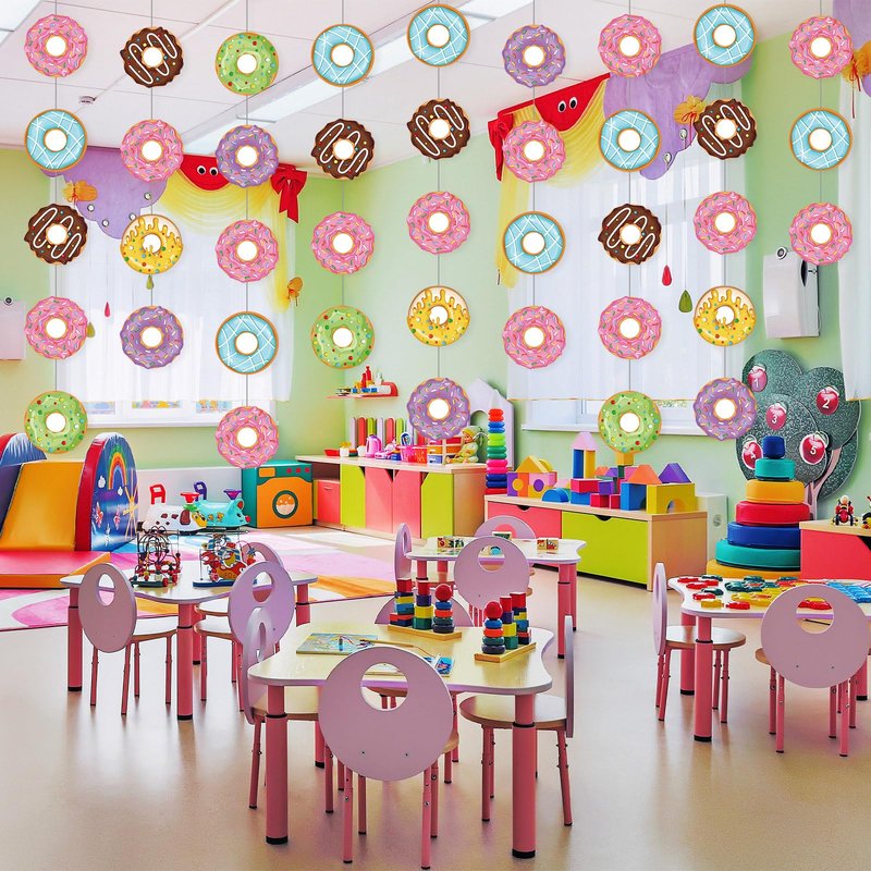 - Cute and Colorful: Each donut hanging banner comes with 7 pieces of different donut paper cutouts; Each of them is double-sided printing which can see them from anywhere; That makes them can easily create a fun and playful atmosphere for any donut themed party