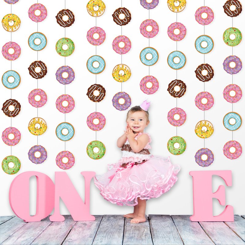 - Suitable Size: the length of each donuts hanging swirl is about 39.4 inch while the distance between each donut pattern is about 2.3 to 2.7 inch; The size of doughnut paper cutouts on the party banners is about 4 x 4 inch
