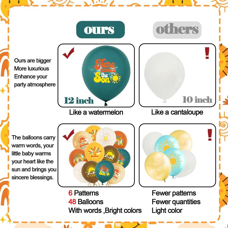 - 【Upgraded Design】Our boho sun balloons are designed with bright colors and attractive sunshine patterns, not only upgraded colors and patterns, but also each style comes with words suitable for boy's baby shower party to make you feel the warmth of the sunshine.