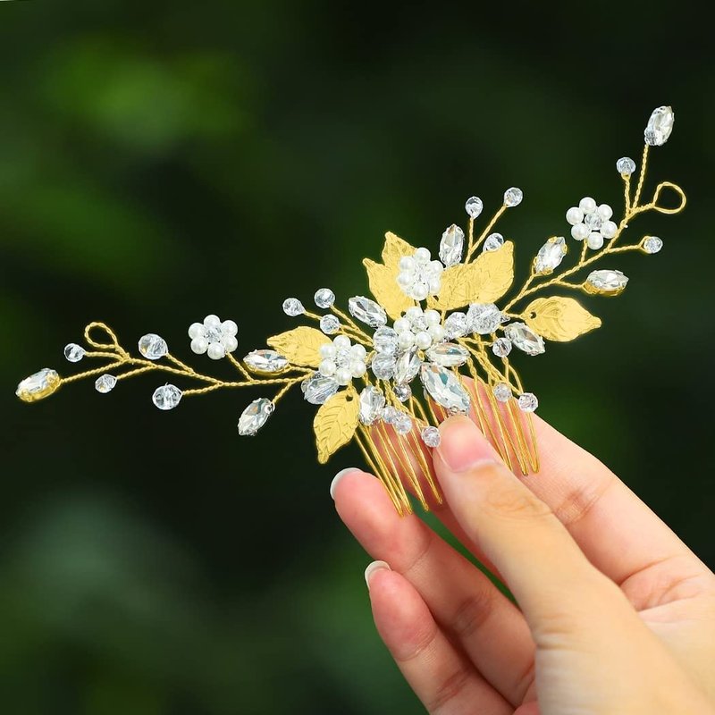 Heread Leaf Bride Wedding Hair Comb Crystal Bridal Hair Accessories Pearl Hair Piece for Women and Girls (C Gold)