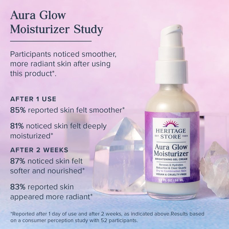 HERITAGE STORE Aura Glow Face Moisturizer for Dry Combination Skin - Gel Facial Moisturizer Brightens, Firms Skin’s Appearance, Adds Radiance w/Bakuchiol, Clear Quartz, Vegan, 60-Day Guarantee, 1.9oz