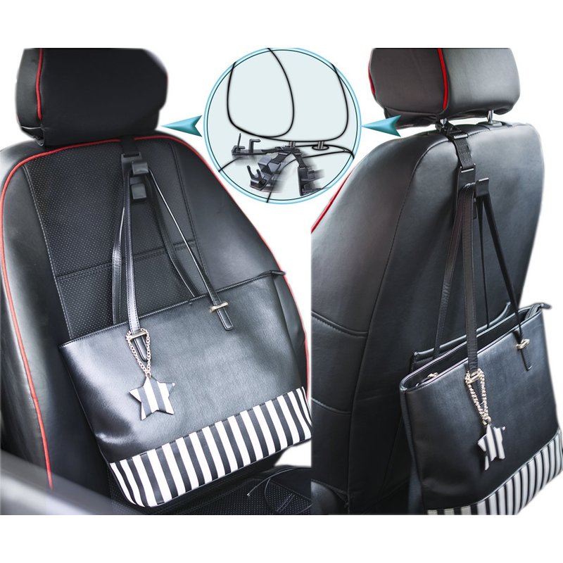 - HANDY: You will no longer have to put the stuff on the floor or the seat. The headrest hooks are so convenient to hang your PURSE, BAGS, water-bottle, backpack, handbag, jacket and KEEPS THEM WITHIN REACH. Especially as a Woman, it is useful to keep the bags from rolling around in the car. And it is LENGTH and WIDE enough for the short and thick handles.