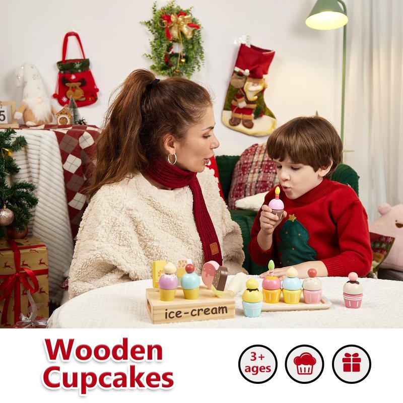 HERSITY Wooden Cupcakes Toys Pretend Play Food Desserts Kids Baking Set, Kitchen Playset for Toddlers 3-5, Tea Party for Little Girls Cooking Games Age 3 4 5 Years Old Girls Boys