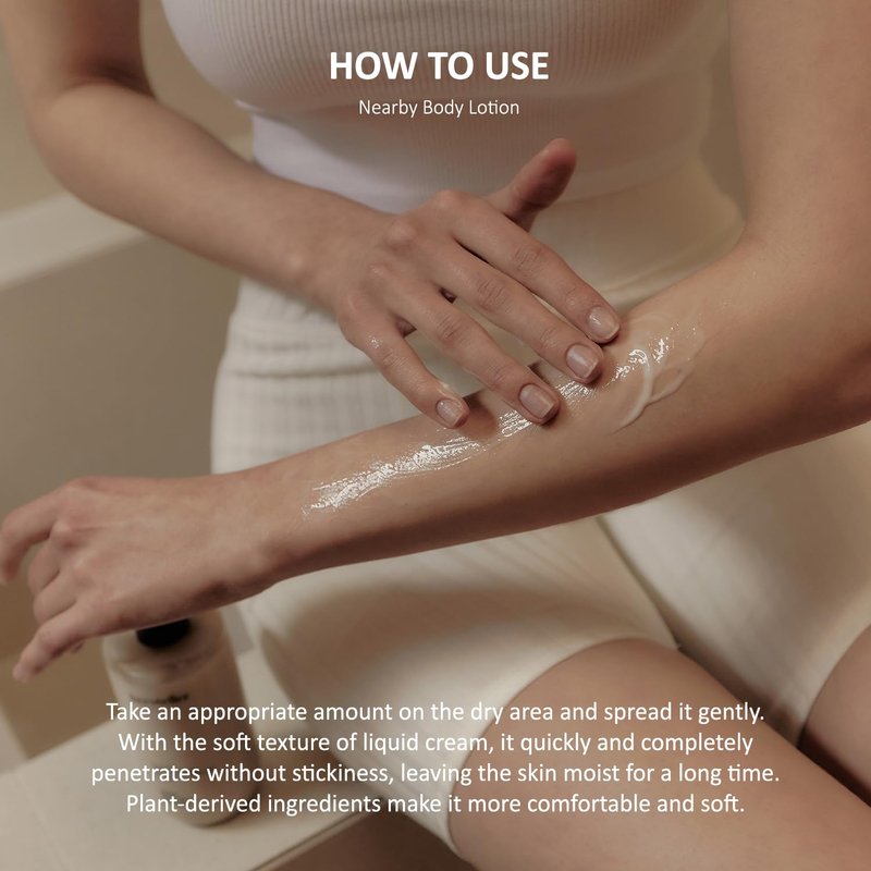 - VEGAN BODY LOTION – Scented vegan body care with sensual scents found in nature, NEARBY Body Lotion contains over 85% plant-derived ingredients, glides on the skin comfortably, and gets absorbed into the skin quickly. It also contains grain complex, vegan butter, eco ceramide, which form a high-density moisture barrier that protects skin and keeps it healthy. The sensual scents, together with the warmth of skin, leaves a pleasant, lingering smell that will make you feel calm all day long.