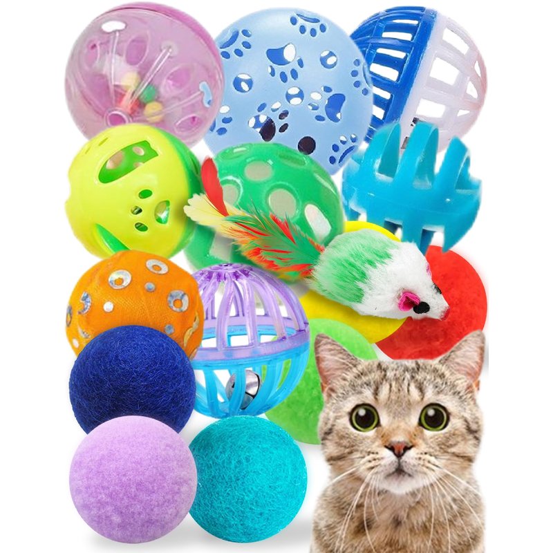 - The Cat Toy Pack Has 15 Toys for Cats Inside: 8 of them are jingle balls for cats, 6 are fluffy balls for cats, and there's also 1 tiny toy mouse.