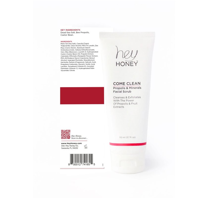 Hey Honey, Come Clean Propolis & Mineral Facial Scrub. Rich, Exfoliating, Dead Sea Salt Scrub designed to be gentle enough for even the most sensitive skin. 110ml