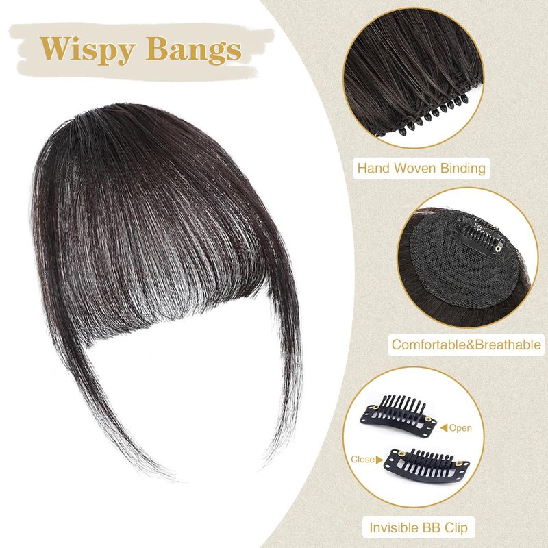 - DIY WISPY BANGS: The Wispy Bangs are very thin and the most popular air bangs hairpin, giving people a refreshing feeling; French bangs have enough hair volume and thickness to cover your forehead, so don't worry about sparsity. The sideburns on both sides can correct different facial shapes. And when it's too long or not needed, you can also trim it