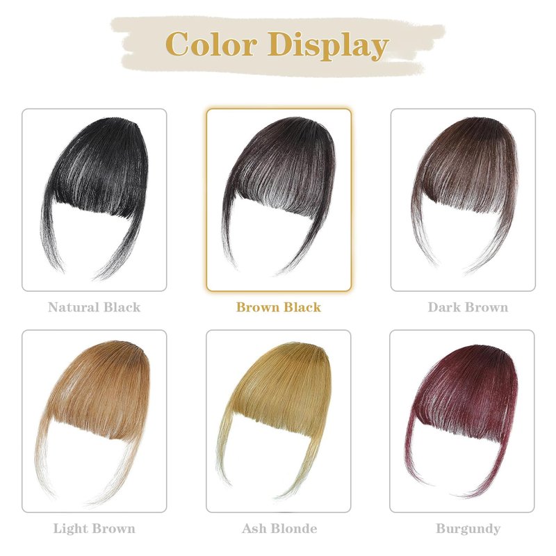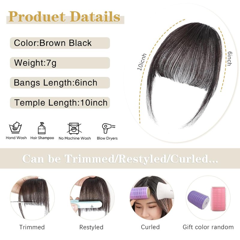 - CLIP IN BANGS: 100% human hair is clipped onto the bangs, perfectly blending into your own hair, creating the most realistic natural effect with the same luster, softness, and smoothness as your hair. No tangling, no shedding, no odor, it can be curled, straightened, trimmed, or dyed to other colors you like