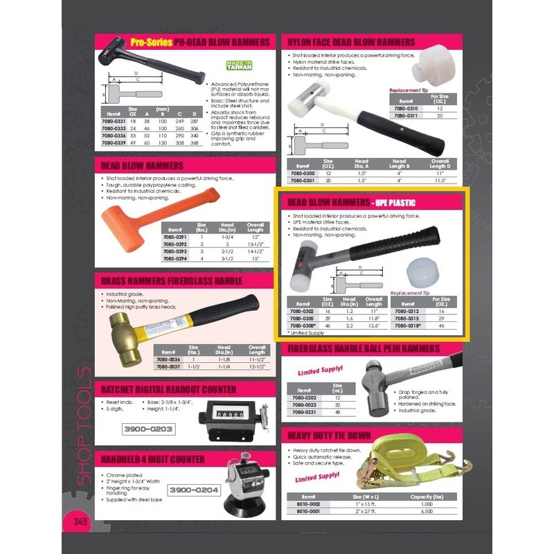 - HAMMER SPECS: 1.6” Head Diameter, 11.8” Total Length; Available in 3 different weights – 16oz, 29oz and 46oz; Tool is resistant to industrial chemicals and is non-marring and non-sparking