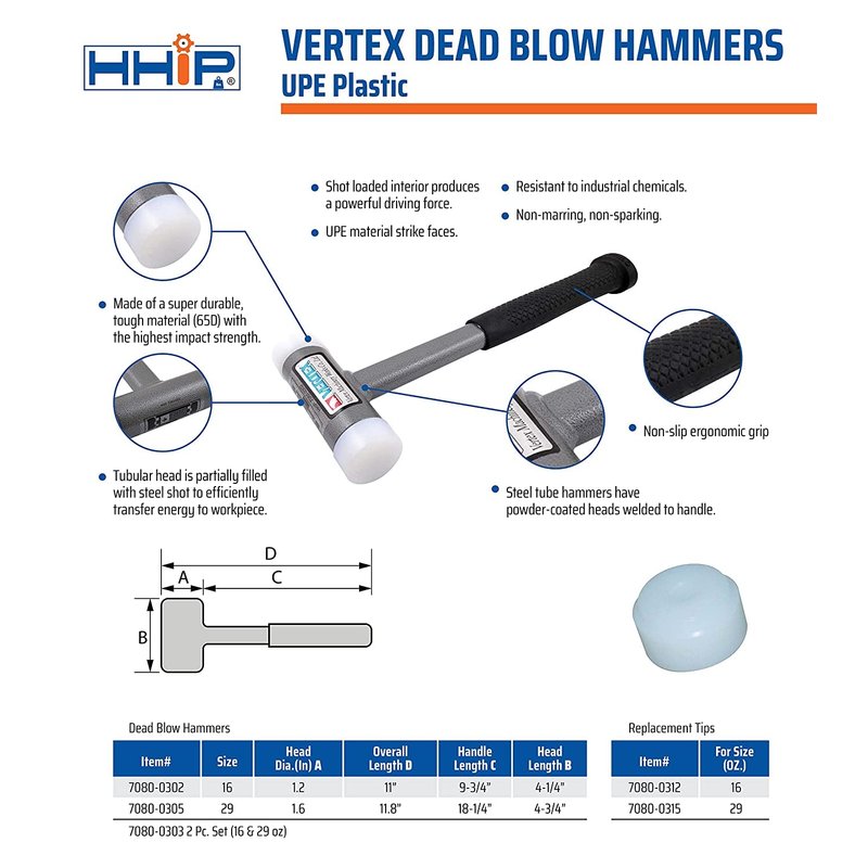 HHIP Pro Series 7080-0305 Vertex Dead Blow Hammer, Deadblow Mallet w/UPE Plastic Face, 1.6” Diameter Steel Shot Head, Non-Marring, 29 oz
