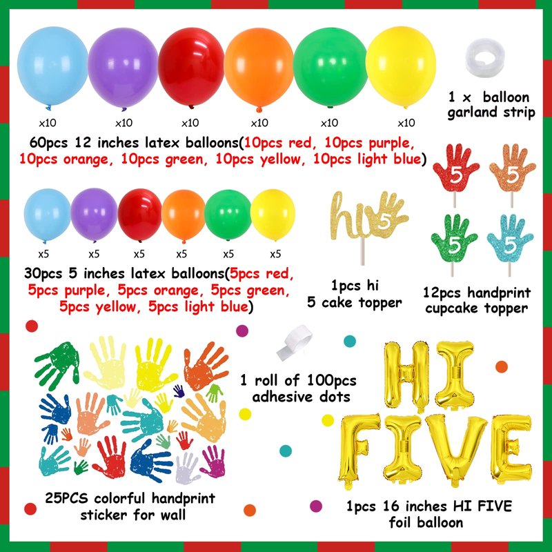 Party Decoration Includes: 60pcs 12 inches latex balloons(10pcs red, 10pcs purple, 10pcs orange, 10pcs green, 10pcs yellow, 10pcs light blue) 30pcs 5 inches latex balloons(5pcs red, 5pcs purple, 5pcs orange, 5pcs green, 5pcs yellow, 5pcs light blue) 1pcs 16 inches HI FIVE foil balloon 25PCS colorful handprint sticker for wall 12pcs handprint cupcake topper 1pcs hi 5 cake topper 1 x balloon garland strip 1 roll of 100pcs adhesive dots