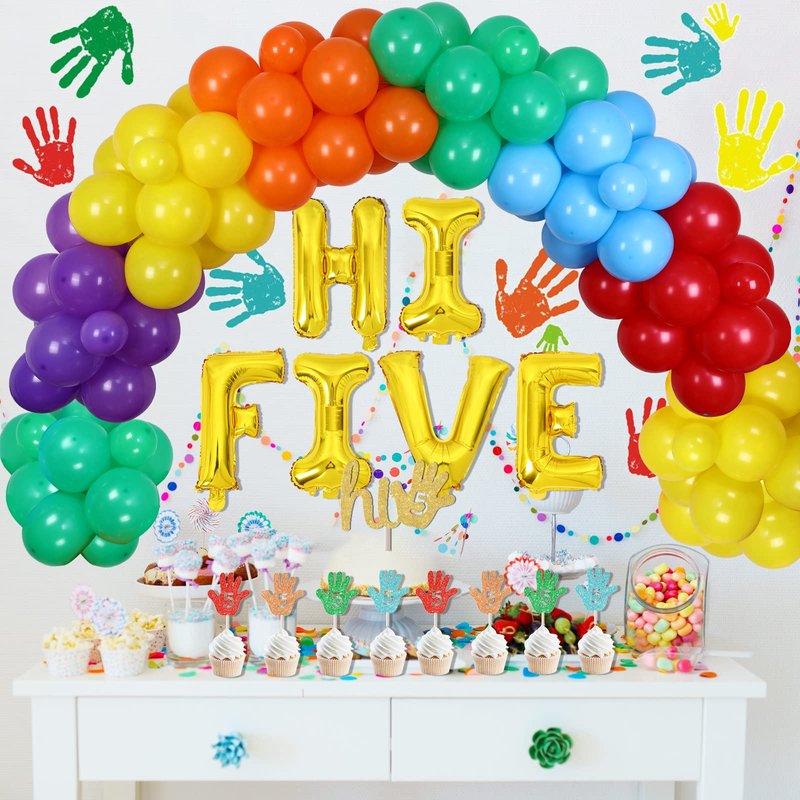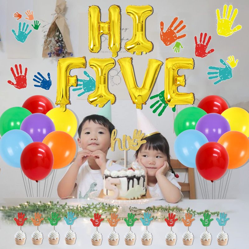 - [Unique Design]: Hi Five 5th birthday party supplies perfect for little kids boy girl cheers to 5 years old birthday, colorful latex balloons garland with HI FIVE foil balloon banner, handprint sticker brings joyful and meanings, handprint 5 glitter cake topper and cupcake topper special design for 5th birthday