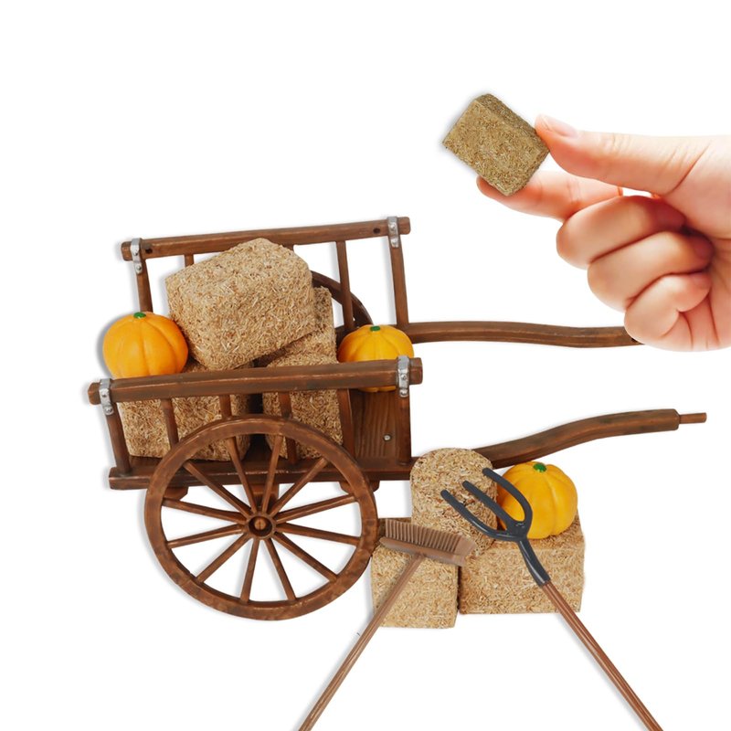 - 14PCS: The harvest miniature set includes 8 mini haystack decorations, 1 plastic cart, 1 set of farming tools, and 3 miniature pumpkins. With everything you need included, this mini hay bales kit is perfect for all your DIY craft and decoration needs. Practical and lifelike.