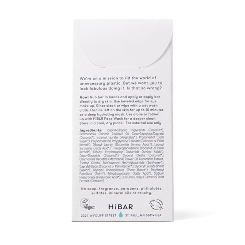 Designed with eco-conscious consumers in mind, this solid oil makeup remover helps reduce plastic waste and is shipped in recyclable packaging. It's free from parabens, sulfates, and animal testing, making it a cruelty-free and gentle choice for all skin types. The compact, travel size makeup remover is perfect for on-the-go use. Elevate your skincare routine with HiBAR's innovative, sustainable solution for clean and nourished skin. Say goodbye to makeup and impurities, and hello to a radiant complexion with HiBAR's oil face cleanser.