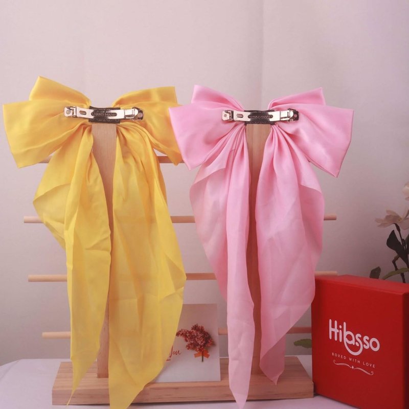 Hibasso 2-Piece Silky Satin Hair Bows Set for Women, Girls with Long Tails and Metal Clips – Aesthetic bow hair clip, Stylish Hair Accessories (Light Pink & Bright Yellow)