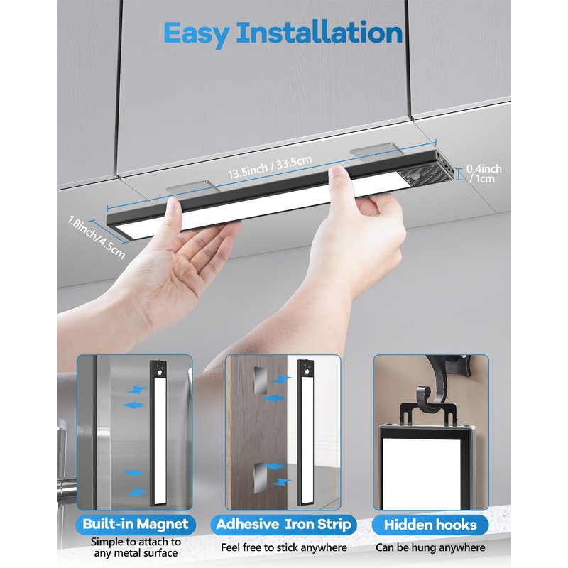 - 【Install in 3 seconds, Wide Application】These under cabinet led lights have built-in magnetic that can easily stick on any iron surface. It also comes with adhesive iron sheets that can stick on any non-iron surface. The hidden hook makes sure the light can hang on anywhere. This installation design allows the led light bar to be easily taken off for charging or changing positions, perfect for bedrooms, cabinets, workshops, basements, garages, hallways, stairwells, etc.
