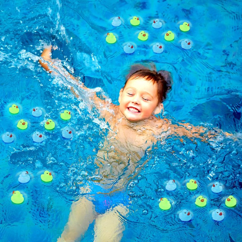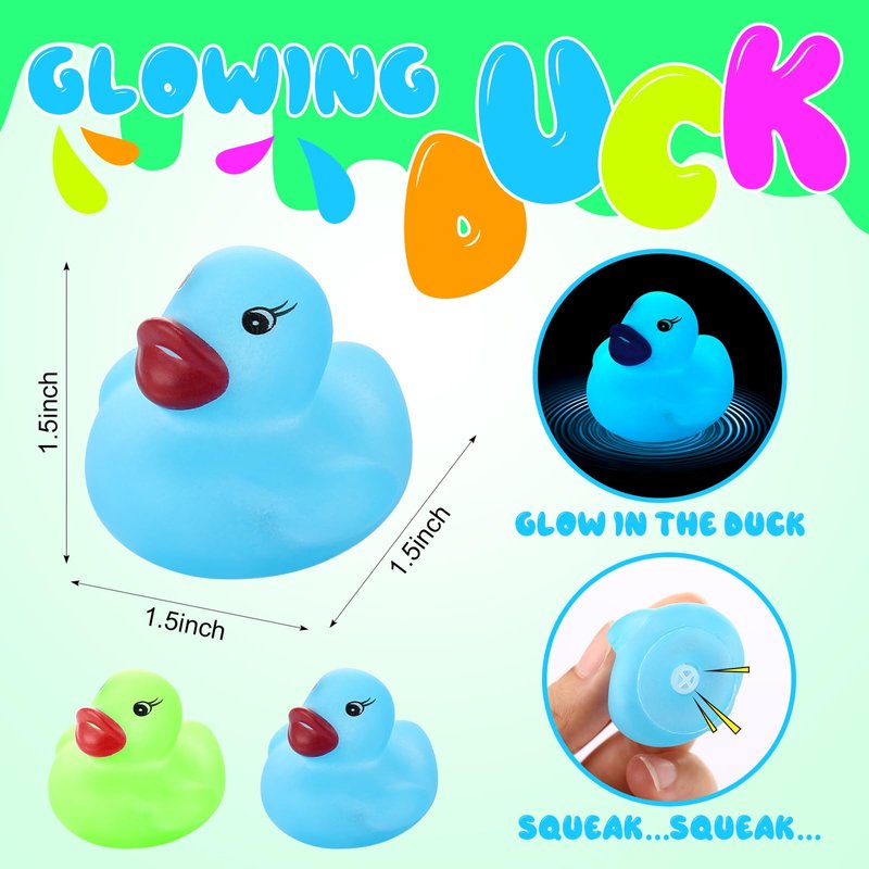 Features: With a glow in the dark design that makes bath time more exciting and interesting, these squeaky light up rubber ducks are a fun update on traditional bath toys. These duck bath toys are adorable and eye catching Specifications: Material: rubber Color: blue and green Size: approx. 1.5 inch tall Package includes: 120 x Glow in the dark rubber ducks Notes: Manual measurement, please allow slight errors on size. The color may exist a slight difference due to different screen displays. People under 12 years old need to use under adult supervision.