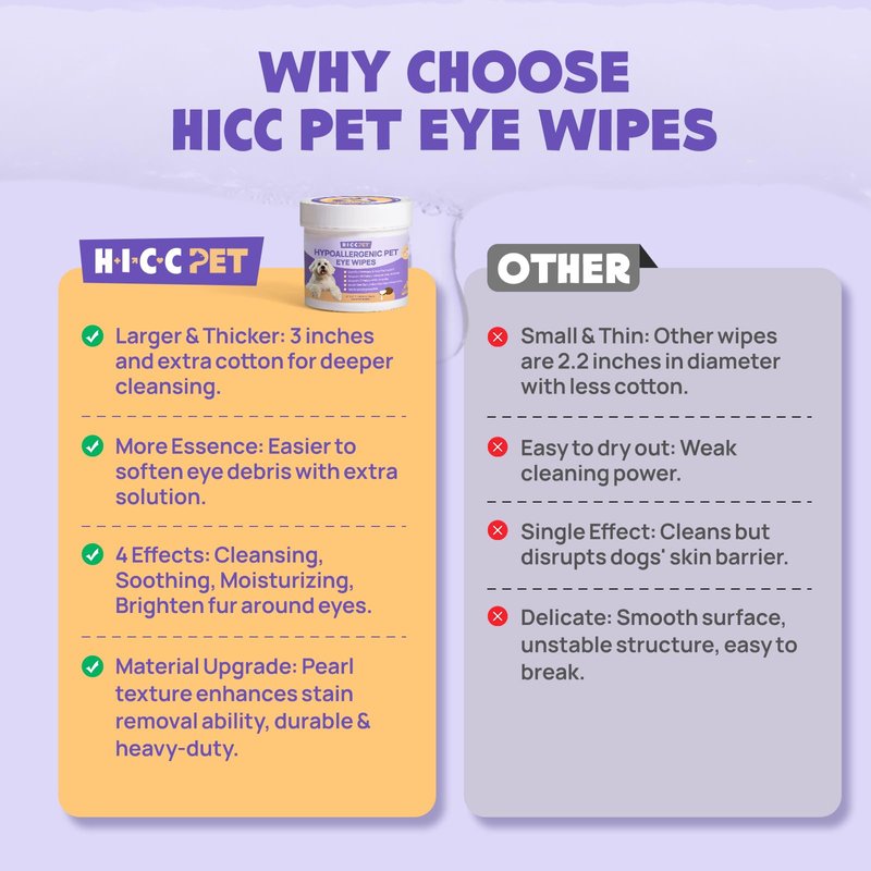 - 【Hypoallergenic and Gentle】HICC Pet Sterile Eye Wash Pads are specially formulated, mild and non-irritating, suitable for pets of all ages, even sensitive skin. Free of alcohol, optical brighteners, Dyes etc. LICK SAFE.