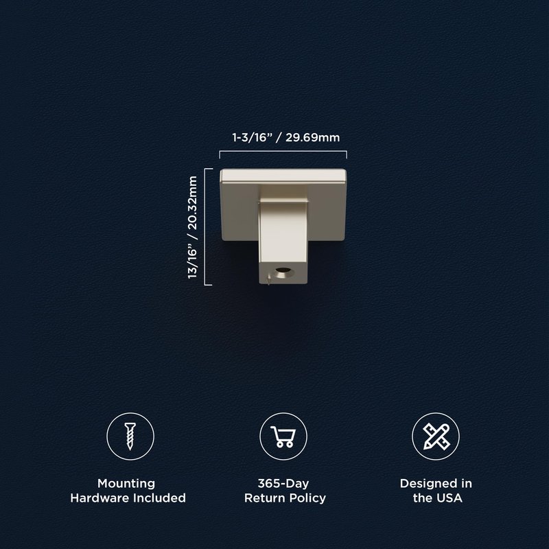 - Effortless Kitchen Cabinet Handles: These 1-3/16 inch square drawer knobs have a diameter of 1-3/16 inches with a 7/16 inch base and 13/16 inch projection; Our cabinet pulls include all the mounting hardware needed to install these drawer pulls quickly